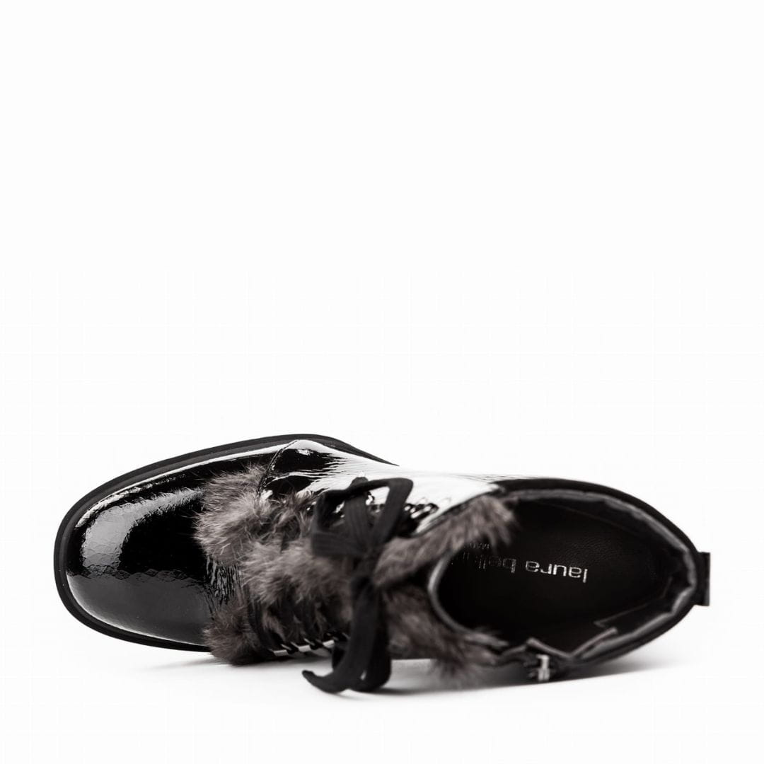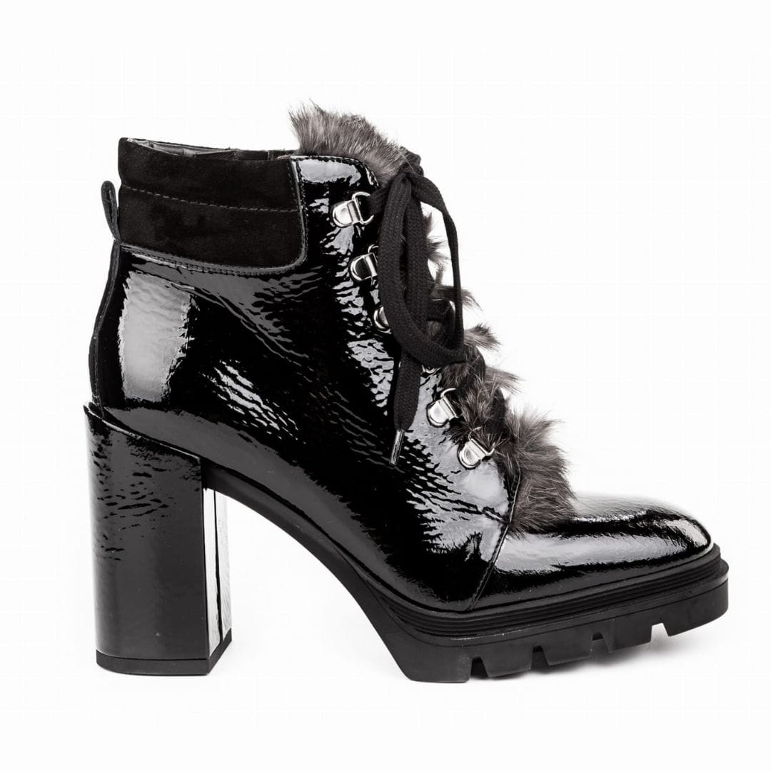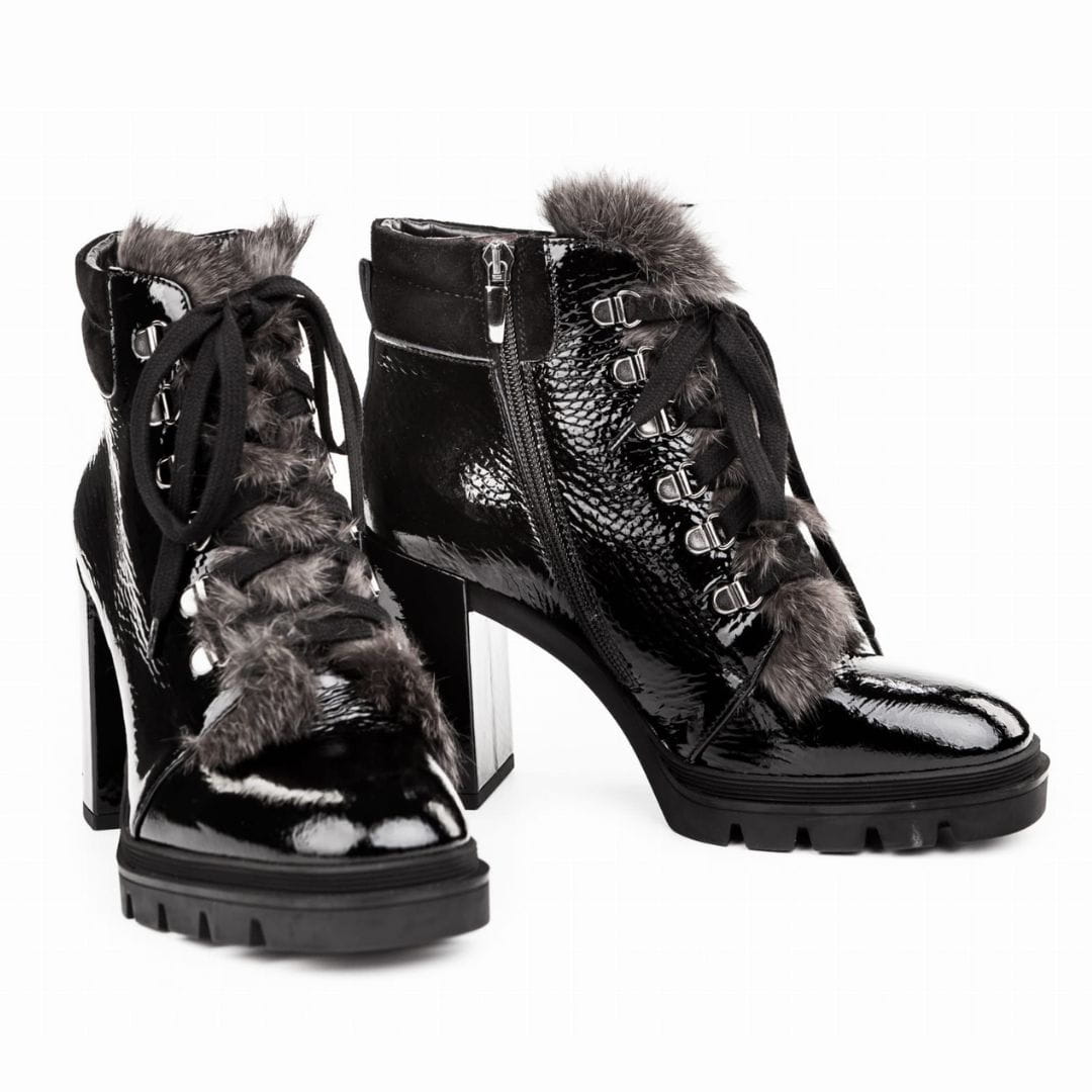 Skrojone według najnowszych trendów w modzie, włoskie botki damskie. Cholewka z lakierowanej skóry naturalnej wykończona na podbiciu futerkiem i stylowym sznurowaniem, zamek od strony wewnętrznej. Wnętrze obuwia ze skóry naturalnej, antypoślizgowa, gruba podeszwa z tworzywa osadzona na bardzo stabilnym obcasie.