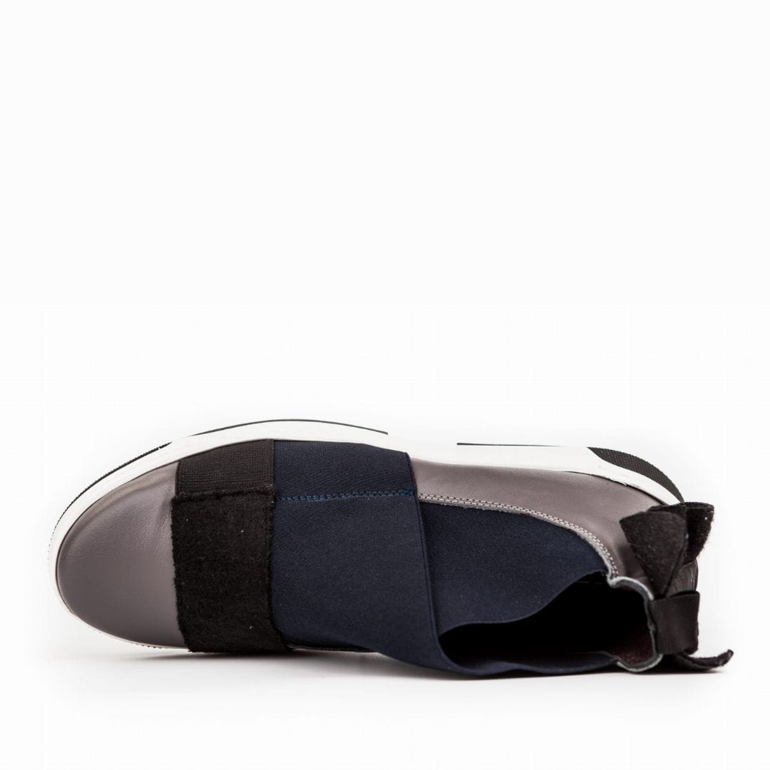 Skrojone według najnowszych trendów w modzie, nietuzinkowe, włoskie półbuty damskie. Cholewka wykonana z wysokiej jakości skór połączonych w doskonałą kompozycje z rozciągliwymi materiałowymi wstawkami, dzięki którym bardzo łatwo wsunąć obuwie na stopę. Skórzane wnętrze z profilowana wkładką i wysokość 5,5 cm czynią te buty doskonałym uzupełnieniem codziennych stylizacji.