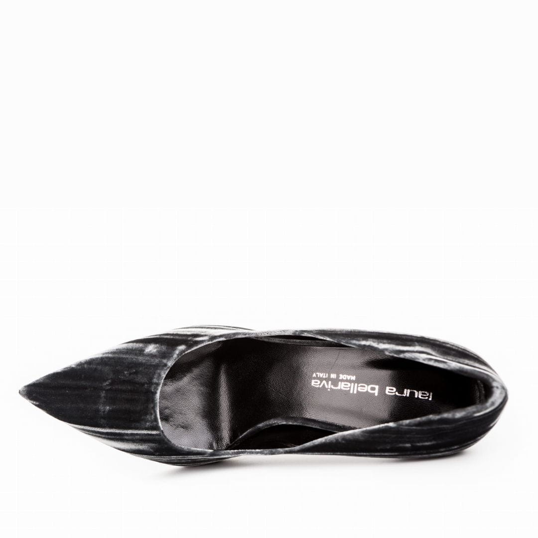 Szpilki damskie włoskiej marki Laura Bellariva. Delikatna, materiałowa cholewka imitująca welur, pięknie skrojony nosek i zgrabny 10,5 cm obcas osadzony tak aby zapewnić maksymalny komfort użytkowania. Model wygląda nieprzeciętnie i niezwykle oryginalnie.